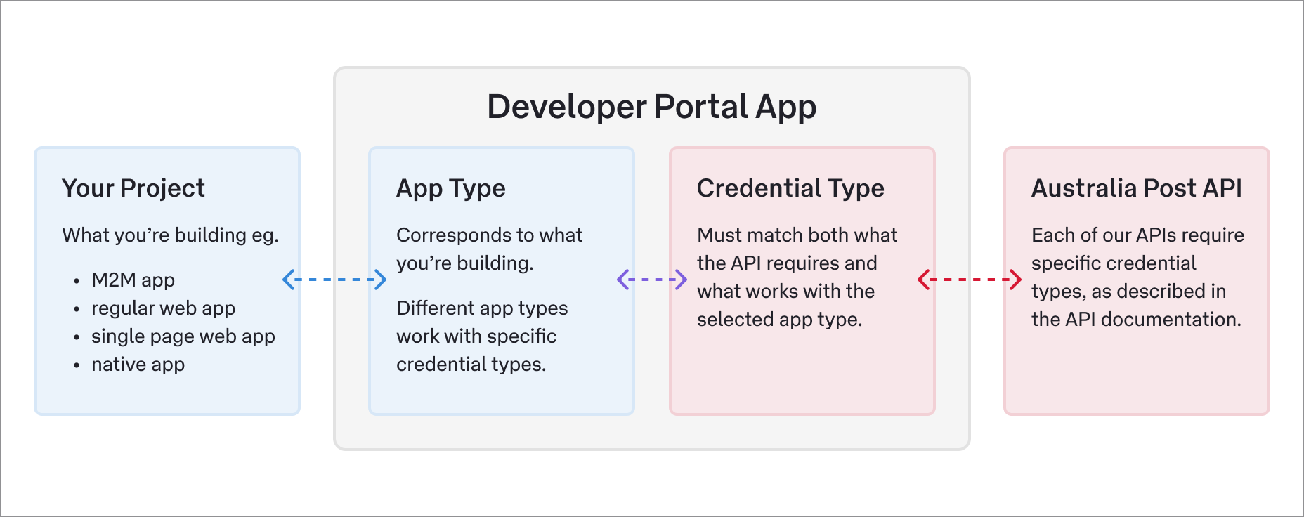 Apps - We use apps to organise the credentials you use with our APIs. Apps act like a container for your credentials. Find out more about the role of apps in the Developer Portal.App types - Each app is assigned an app type. It describes what you're building so we can provide guidance on compatible credentials. Find out more about app types and credentials.Credential types - How an API is secured, and the type of credentials you need to access it, can vary for each API. There are four credential types supported by the Developer Portal. Find out more about the different credential types and how to use them.The role of apps in the Developer Portal